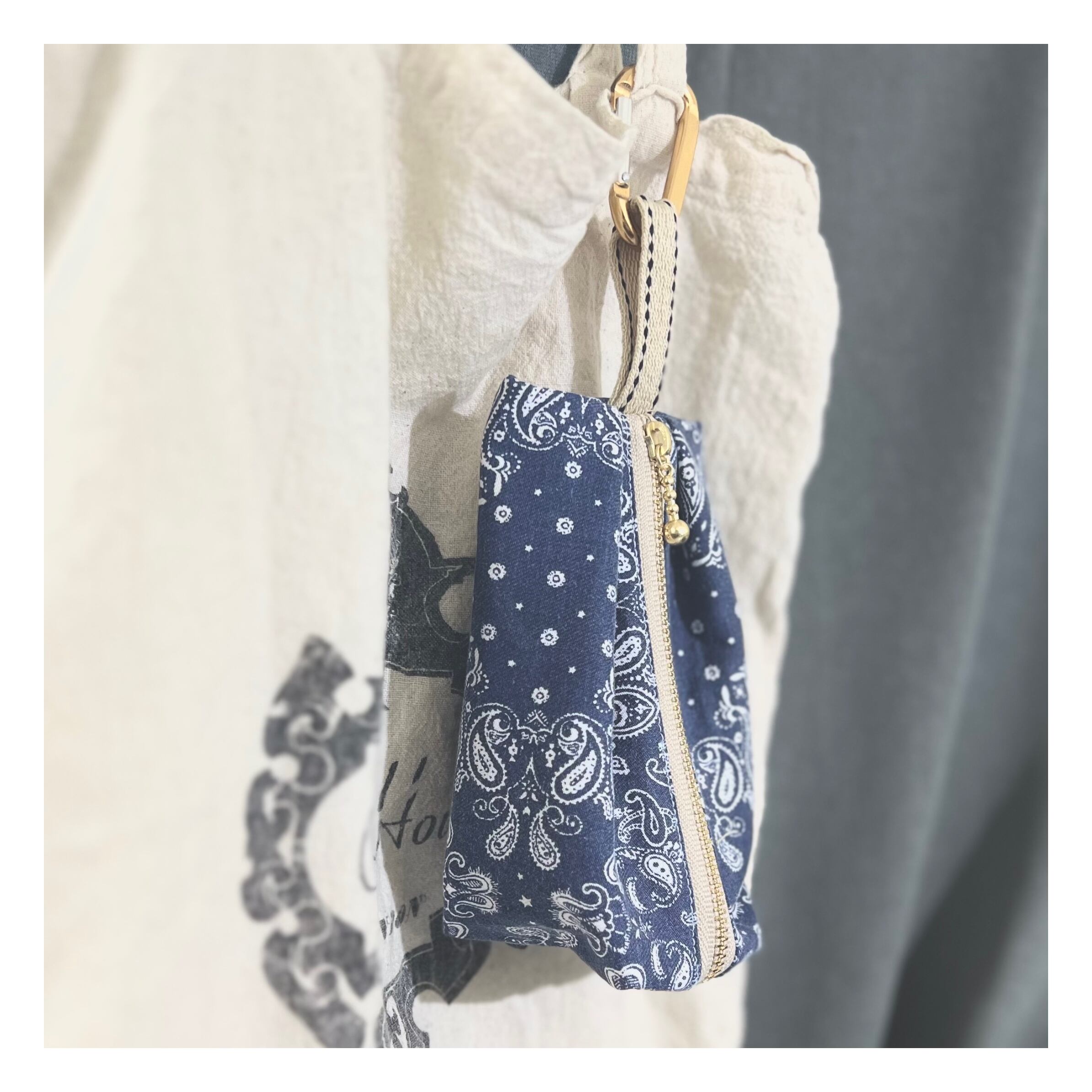 ファスナー仕様で、マチがあるミニポーチなので、お手持ちのカラビナを取り付ければ バッグの取っ手や、デニム等のベルトループに取り付けて使用する事も可能です。