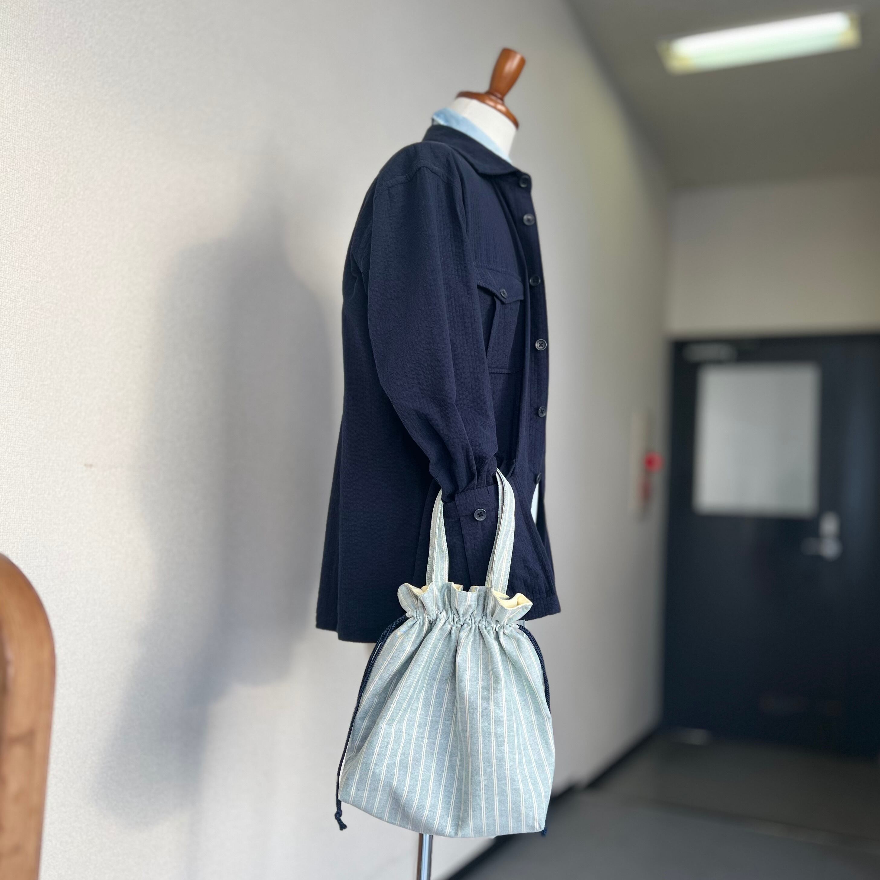 口をギュッと締めると巾着状になるサイズ感の程よいバッグです。