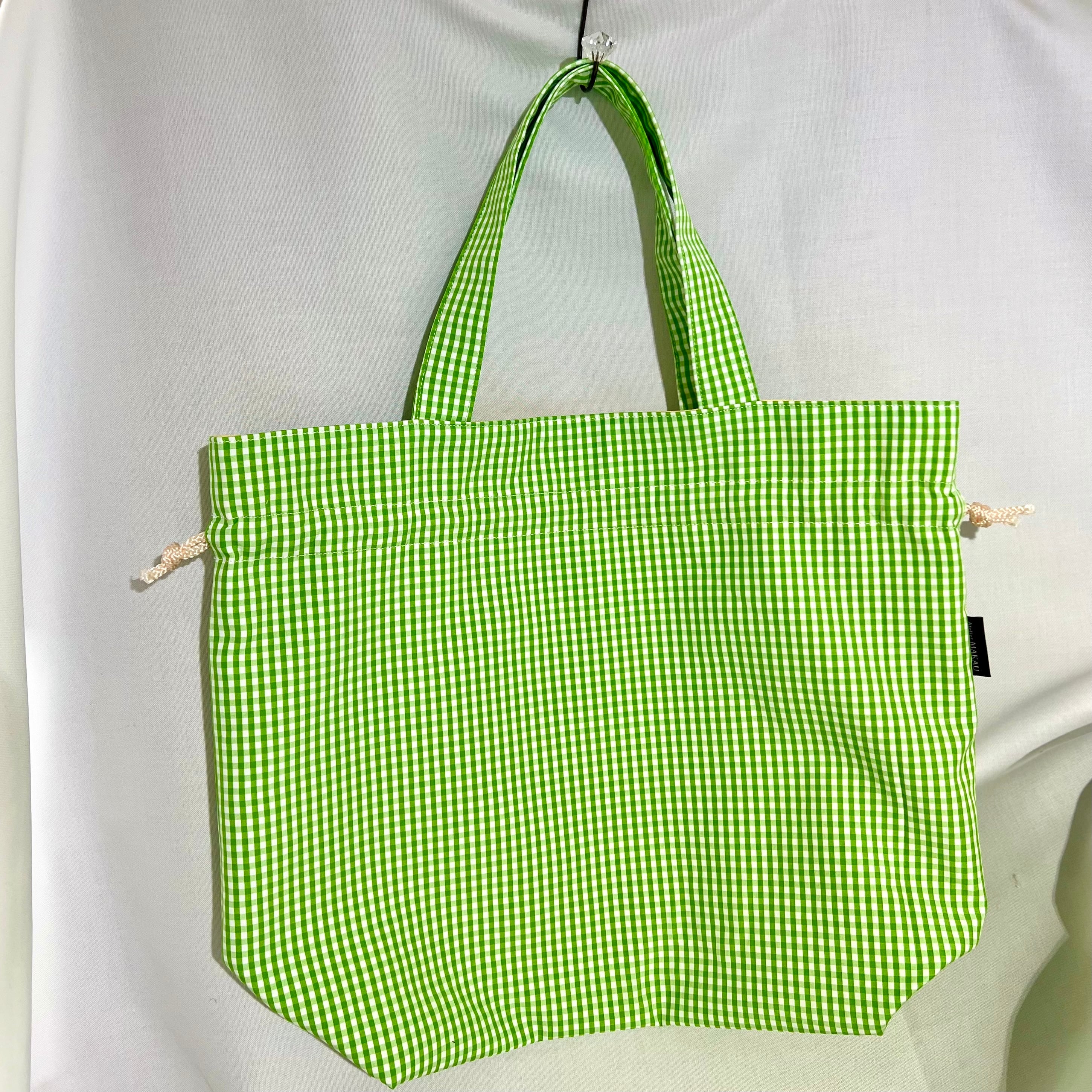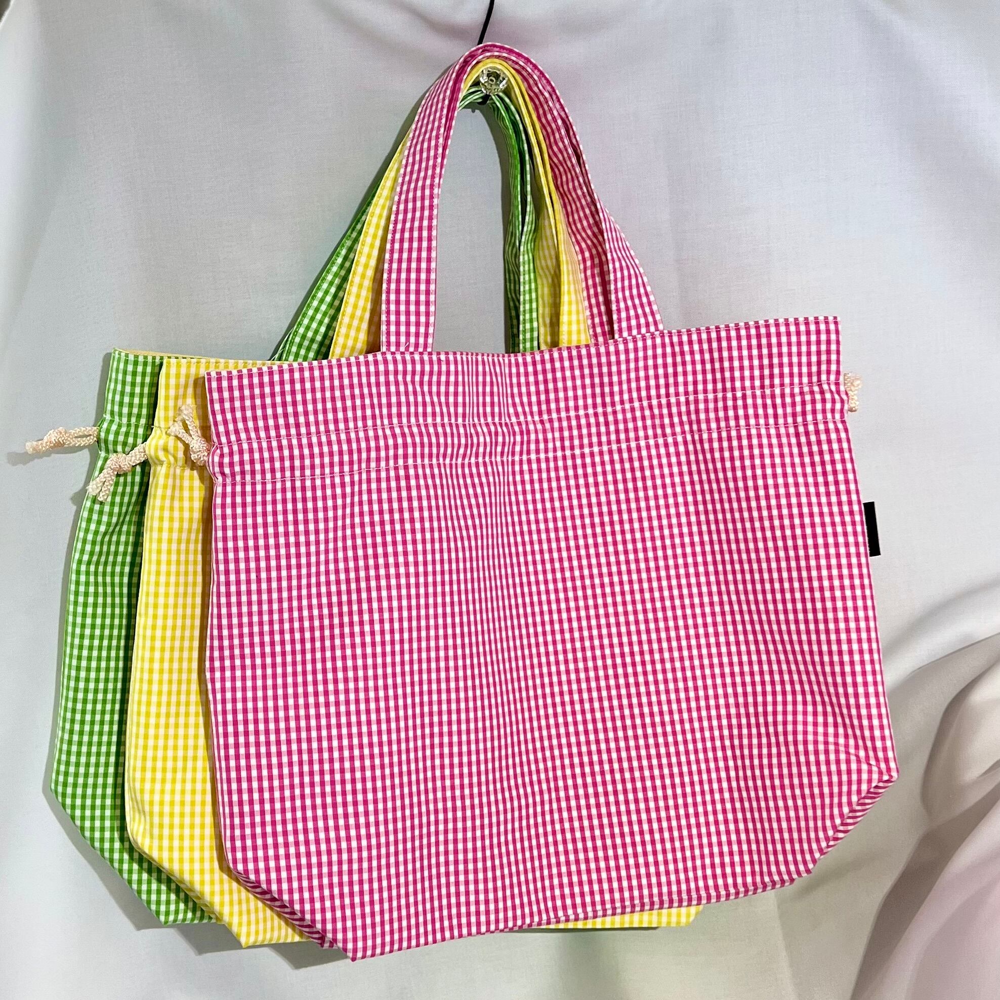 口をギュッと締めると巾着状になるサイズ感の程よいバッグです。