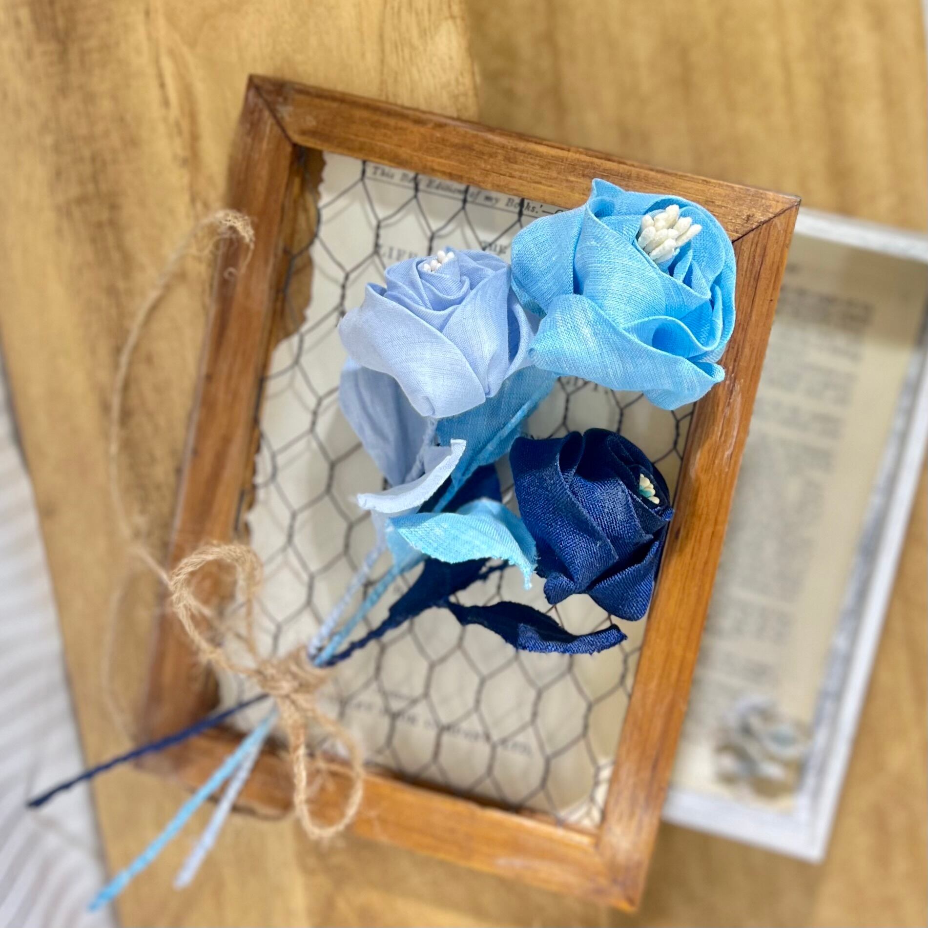 シャツ生地を使用したつまみ細工のインテリア雑貨、ファブリックフラワーのご紹介です。