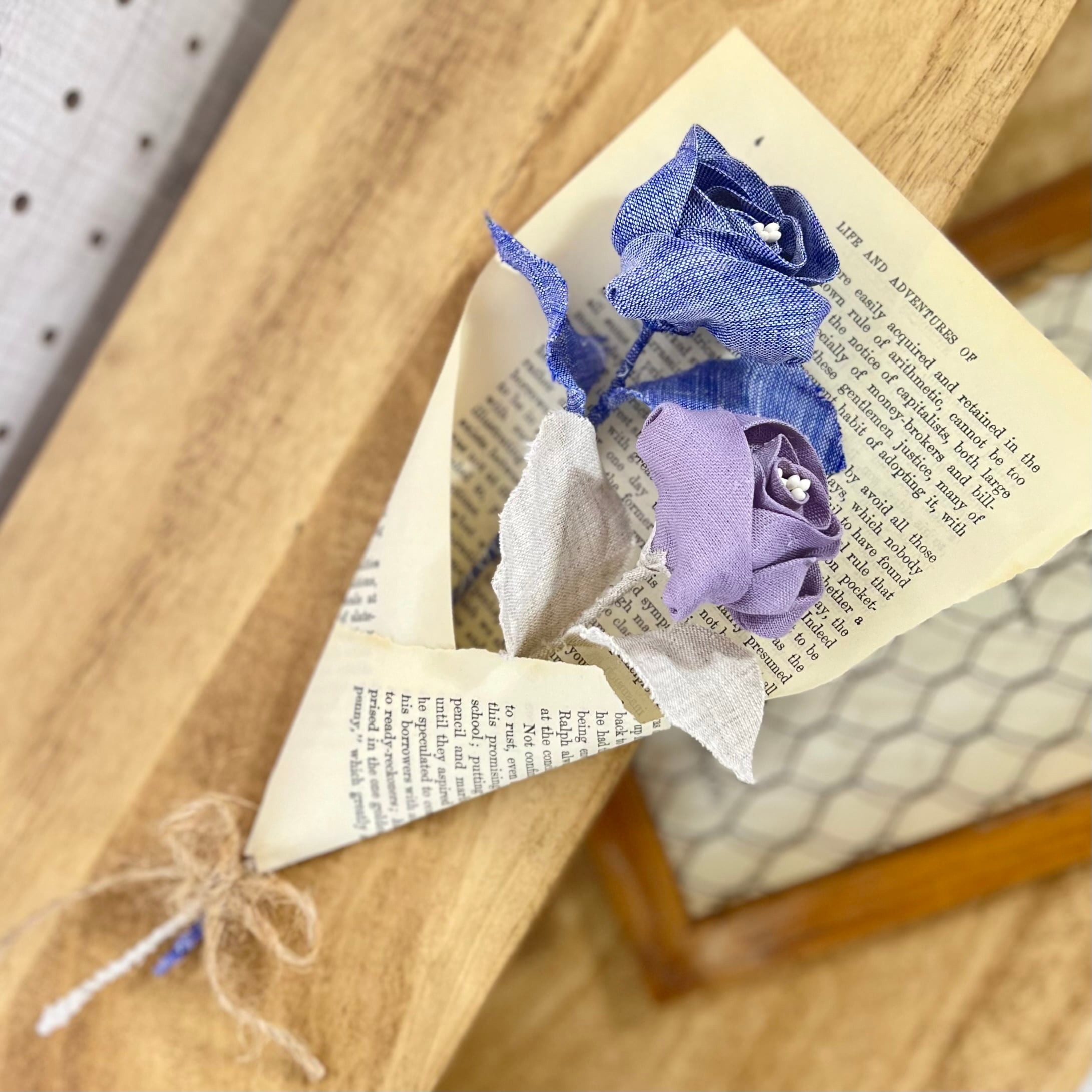 シャツ生地を使用したつまみ細工のインテリア雑貨、ファブリックフラワーのご紹介です。